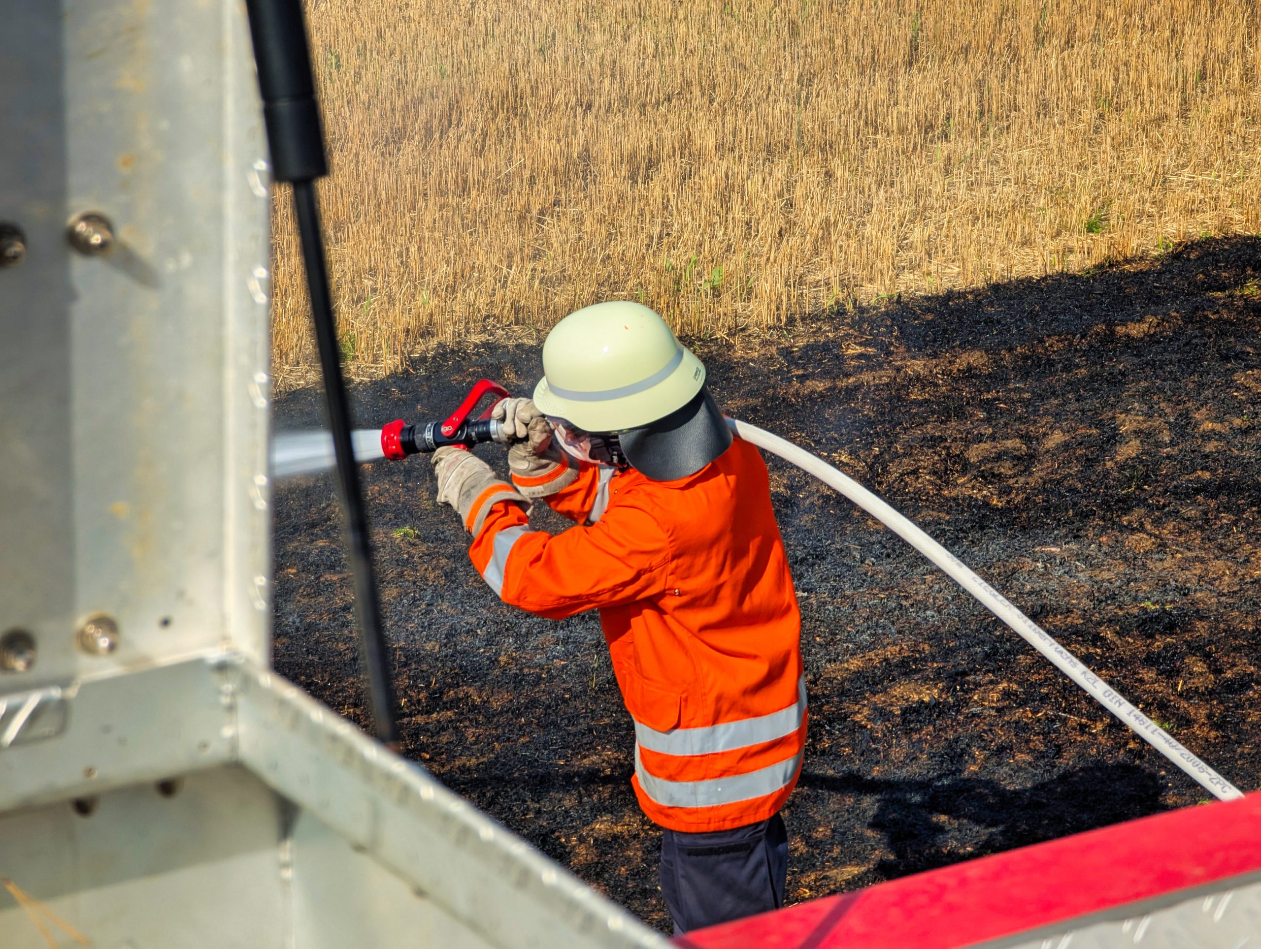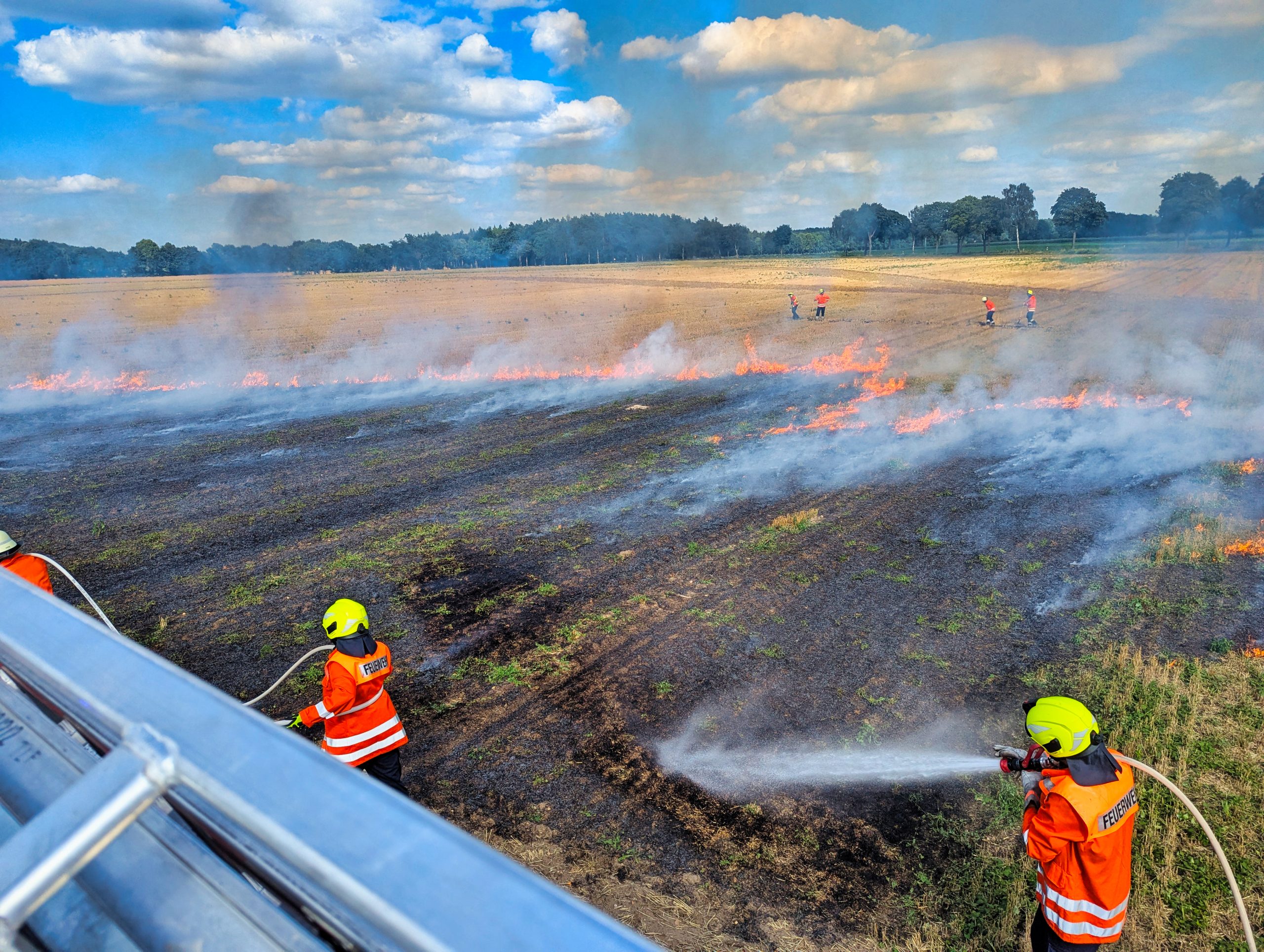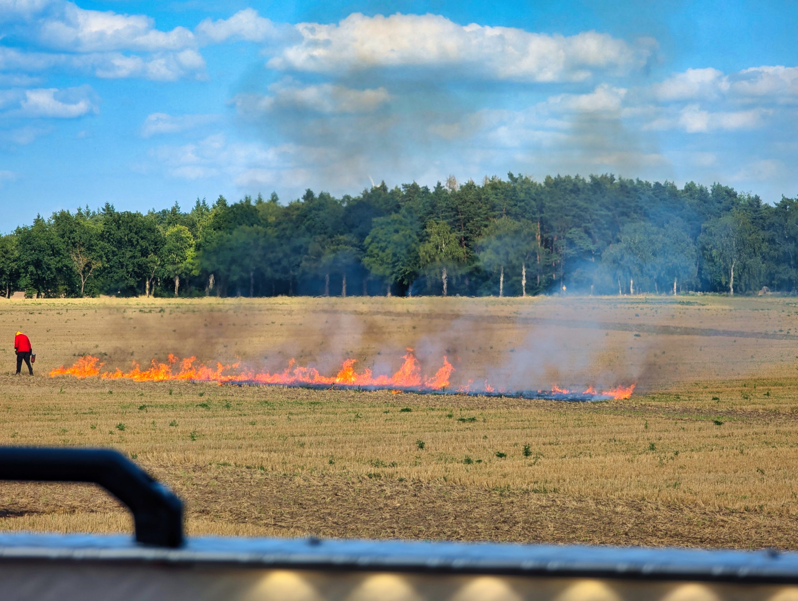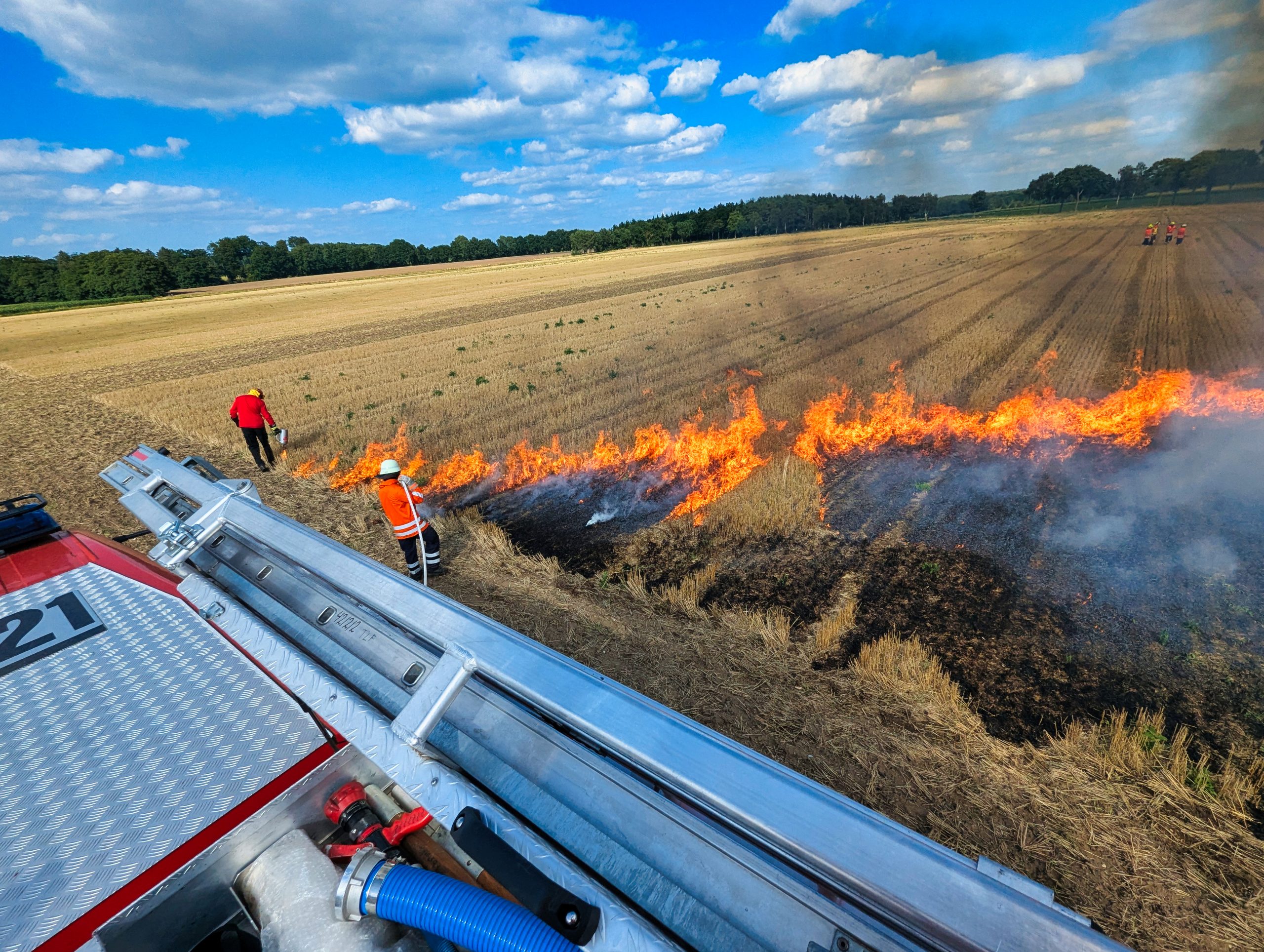 Im Verlauf des Nachmittags kamen dann auch die wasserführenden Fahrzeuge zum Einsatz. Dafür wurde eine größere Stoppelfeldfläche in Brand gesteckt und anschließend im Pump-and-Roll-Verfahren abgelöscht.